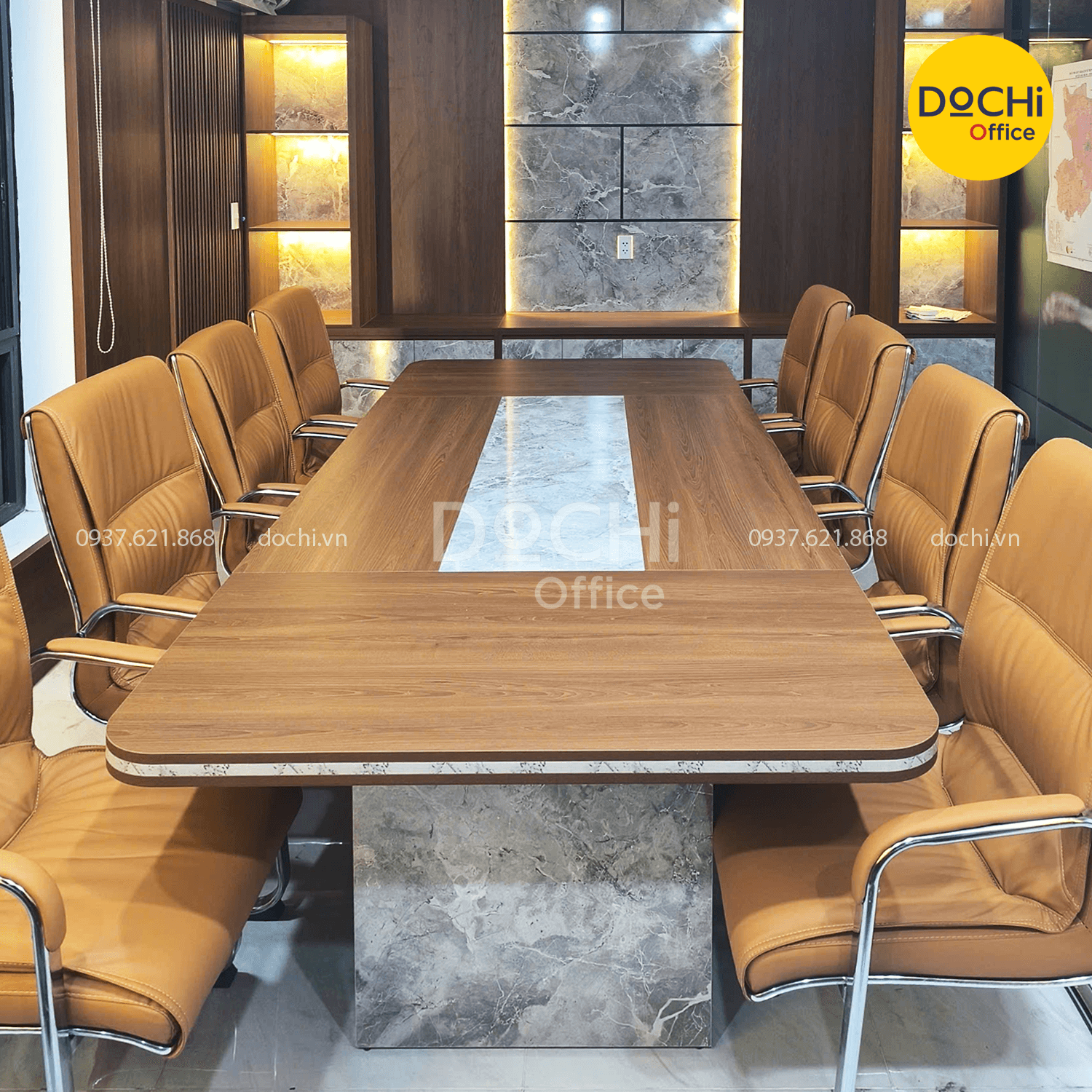 Bàn họp kích thước lớn sử dụng bề mặt gỗ nâu ấm, kết hợp dải đá marble chạy giữa bàn giúp tạo điểm nhấn sang trọng.