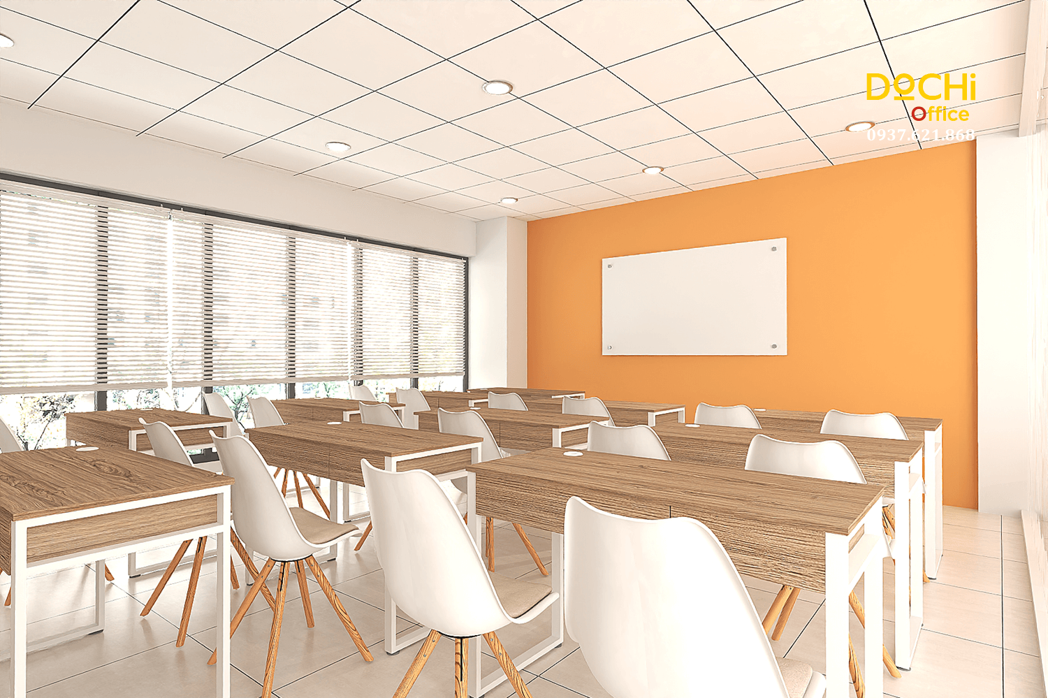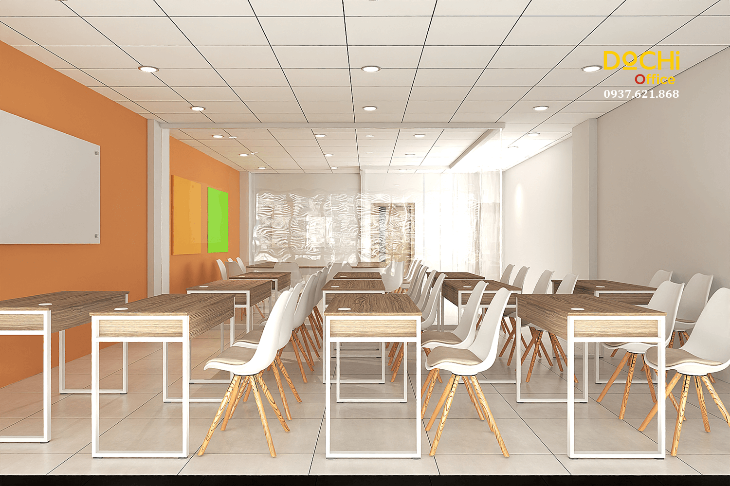 Toàn bộ bố cục tập trung vào sự mạch lạc: bảng ở vị trí trung tâm, đường nhìn thẳng, không có vật cản, tạo một môi trường học tập chuyên nghiệp và tập trung cao.