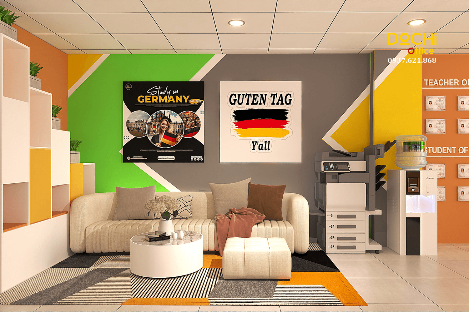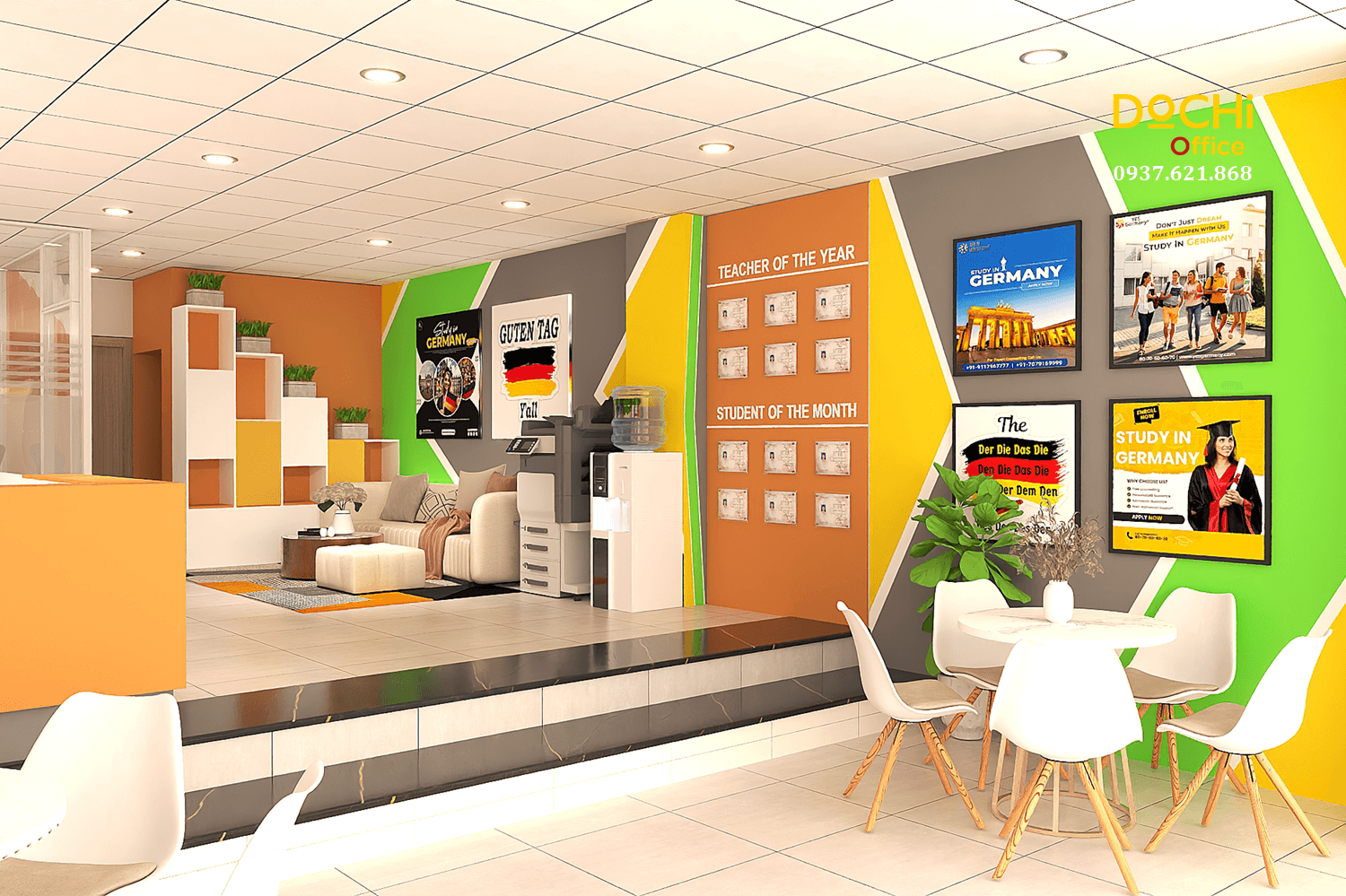 Trong dự án này, bố cục, màu sắc và vật liệu được kết hợp có chủ đích để tạo nên môi trường trẻ trung, năng động và trực quan, đúng tinh thần của một trung tâm ngoại ngữ hiện đại