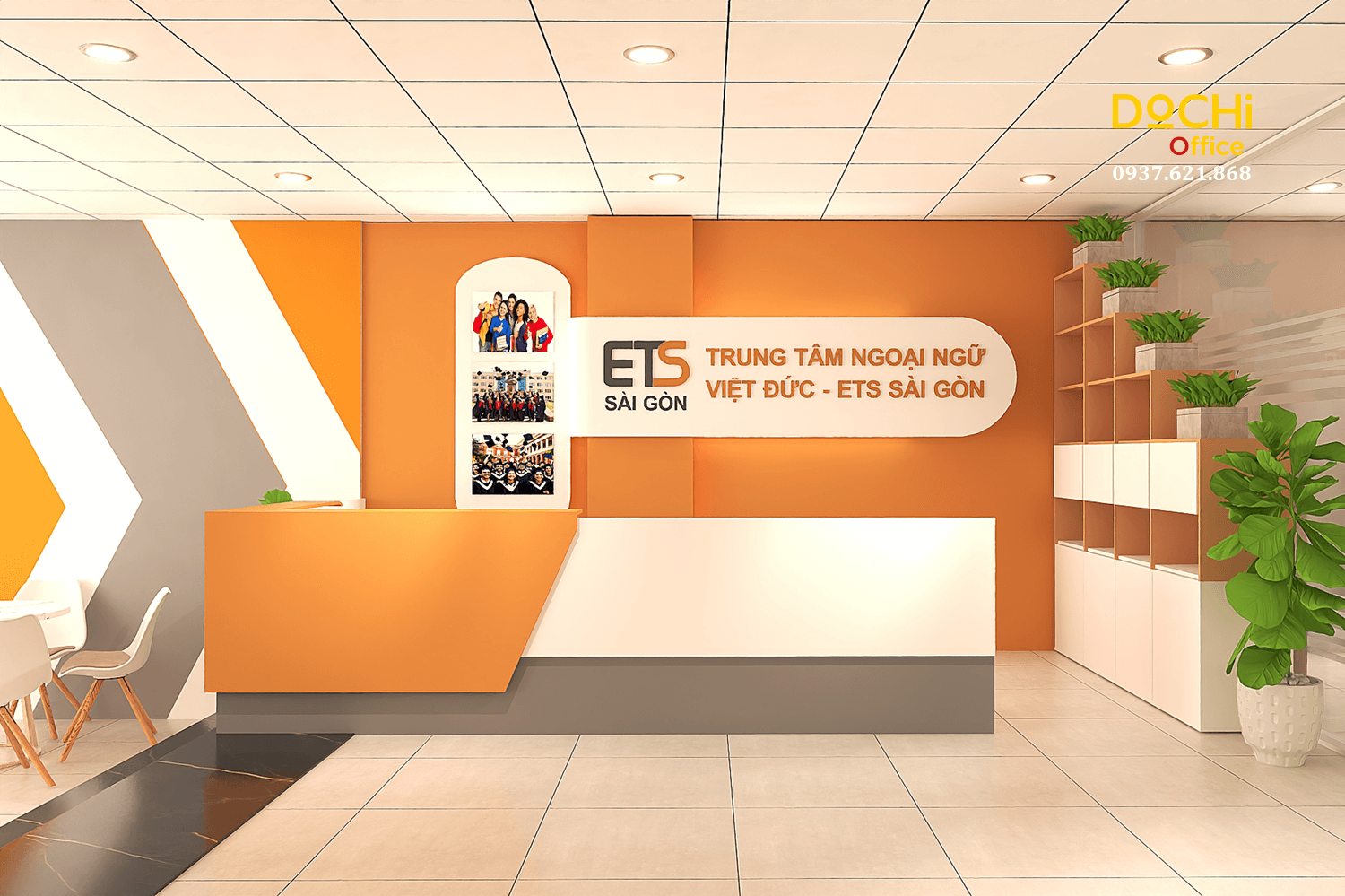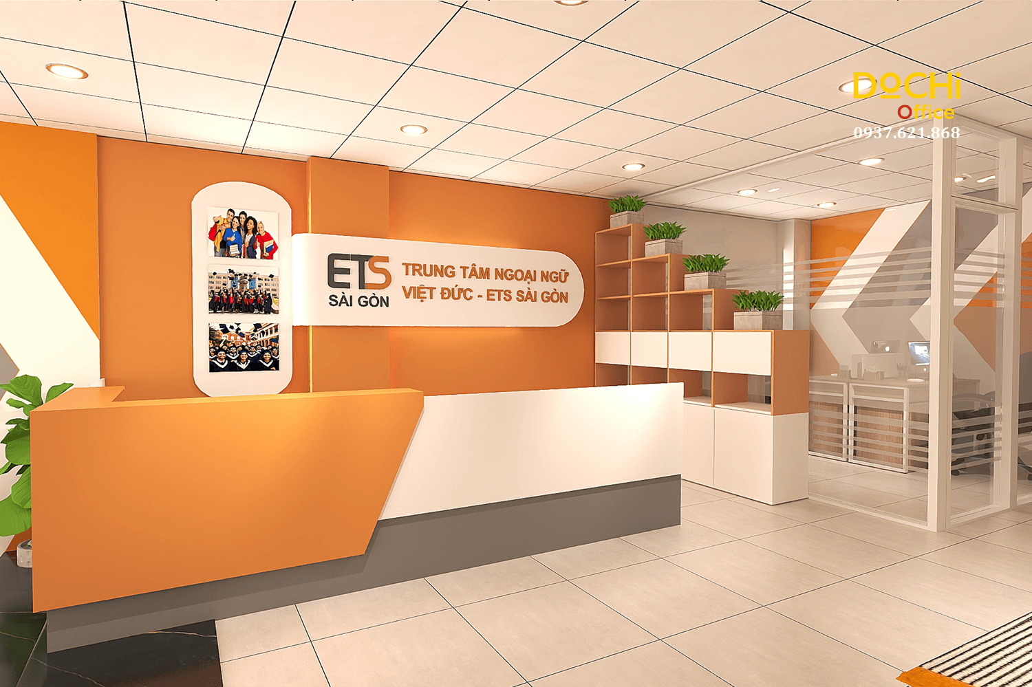 Tổng thể không gian dùng 3 tone chính: cam, trắng và xám, đảm bảo nhận diện thương hiệu ETS Sài Gòn đồng bộ từ quầy lễ tân, vách trang trí đến tường phòng kế toán.